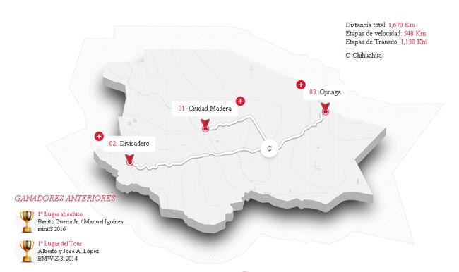 Día 3 : Arrancando a las 8:00 am, desde el estacionamiento del Hotel Soberano, hacia el Este, a la ciudad de Ojinaga, en la frontera con "Presidio", USA (sin cruzar la frontera), a través del sinuoso cañón del Pegüis, con cinco etapas de velocidad (con subida y bajada), servicio, lunch de 40 minutos y de regreso a la ciudad de Chihuahua por la misma ruta, con las mismas cinco etapas de velocidad (subida y bajada), arribando a las 15:00 horas al estacionamiento del Centro comercial "Fashion Mall" para que a las 18:00 se lleve a cabo la premiación del día (medallas), conjuntamente con la premiación final (placas).